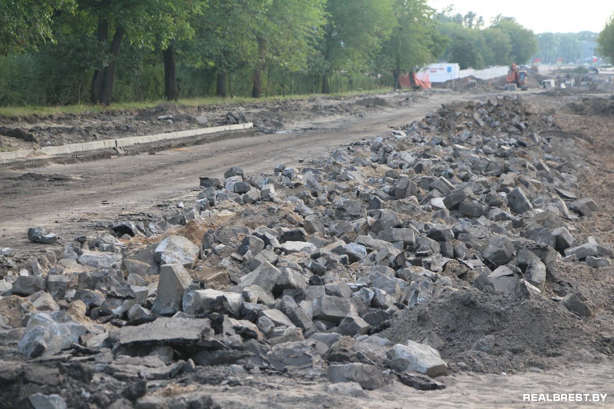 Вся уцелевшая трилинка, которая обнажилась под строительной техникой на проспекте Машерова на 20 000 квадратных метрах, уже демонтирована предприятием «Брестское ДЭП», работники которого вручную отсортировали и уже отвезли себе на склад крепкие экземпляры.