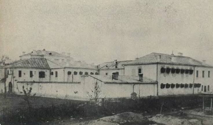 Здание, занимаемое исправительною ротою, до 1830 года было женским монастырем «Бригиток», потом, по закрытии монастыря, в него поселили 2 крепостные арестантские роты, а по преобразовании их в исправительные – последняя тут и осталась. Здание это каменное, 2-х-этажное, с трех сторон огорожено высоким деревянным частоколом. На чистом, песком усыпанном дворе, были: влево – близ частокола – обеденные столы и рядом каменная, недавно построенная кузница; вправо, возле казармы – два деревянные отхожие места (вместо них возводились, при нас, новые, каменные, сзади казармы), гимнастические принадлежности, машины: парильная – для сушки леса и жестяная – для чистки картофеля; там же сарайчик для сушки белья. Входов в казарму три: прямо – в мастерские, влево – в арестантские помещения, а вправо – на кухню. Лестницы, ведущие в верхний этаж, подоконники, чаны, бочки для воды, которую возили на лошадях из реки, ведра – все это было выкрашено малиновою краскою, т.е. цветом тюремного и судебного ведомств…