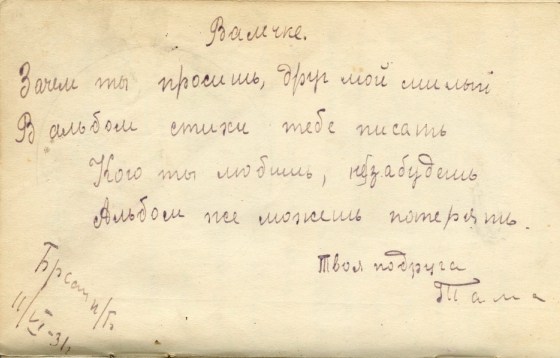 Страничка из детского альбома В.Микуловской. Из фондов Брестского областного краеведческого музея (БРОКМ)