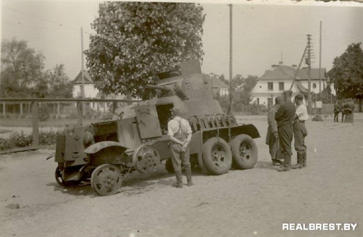 Мною в Интернете найдена интересная фотография, на которой возле парка Свободы стоит подбитый в первый день Великой Отечественной войны бронеавтомобиль «БА-3» Красной Армии. Как видно из сюжета, бои шли не только в крепости, но очаговые военные столкновения происходили в самом городе, а точнее, возле этого парка. В период оккупации фашистами нашего города с 1941 по 1944 годы парк Свободы был местом отдыха не только горожан (дело в том, в парке «1-е Мая» были захоронения военных вермахта, поэтому он был закрыт для посещения), он был популярен и среди фашистских оккупантов. Я видел фотографии, где военнослужащие гитлеровской Германии были изображены на фоне данного парка…