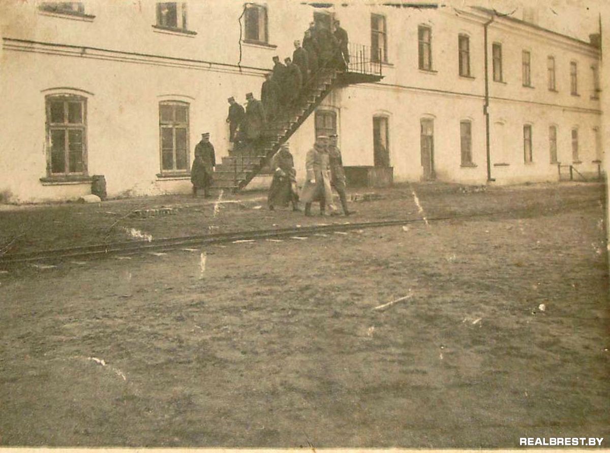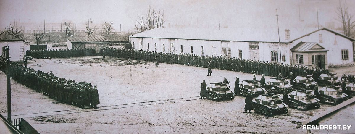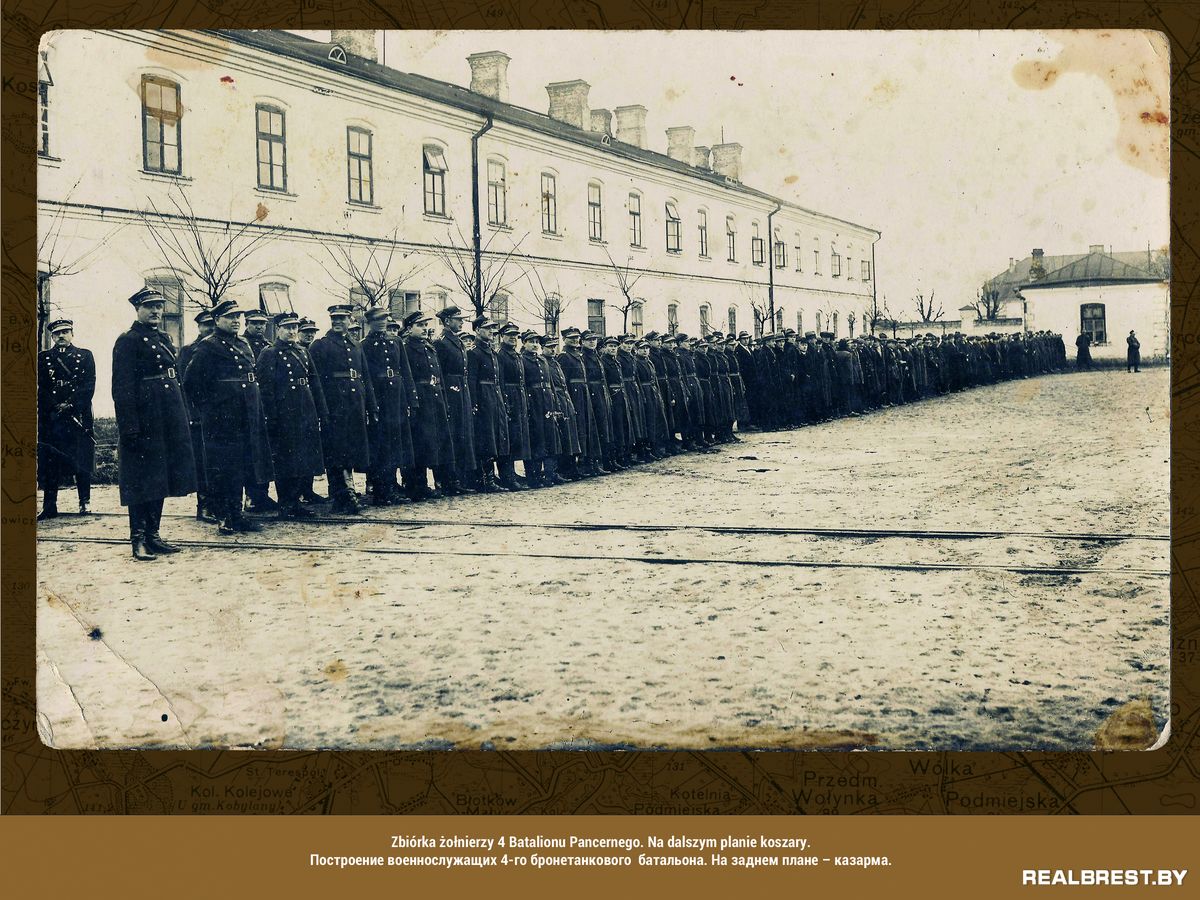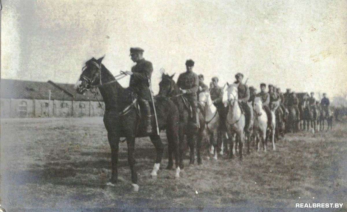 В период кайзеровской оккупации города 1915-1918 г.г. после того, как русские войска, отступая, полностью сожгли Брест-Литовск, проводились работы по восстановлению объектов первостепенной значимости. Так были восстановлены и достроены складские помещения бывшего интендантского городка, казармы и флигеля. На этом уникальном снимке 1920 года, предоставленном для публикации моим коллегой Евгением (из скромности, фамилию не называю), мы видим конный отряд армии Станислава Булак-Балаховича в Брест-Литовске на фоне складов бывшего интендантского городка.