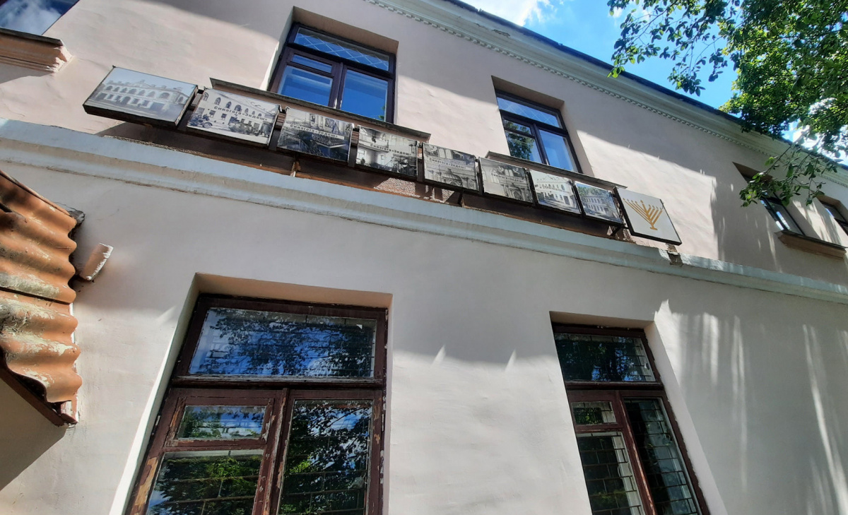 Пока синагогу можно узнать по историческом фото на фасаде и изображению меноры – храмового семисвечника