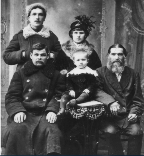 В нижнем ряду (слева направо) Никита Роменко, ребенок Аркадий Падюков, Никифор Падюков. Стоят: Николай Падюков и Анна Падюкова