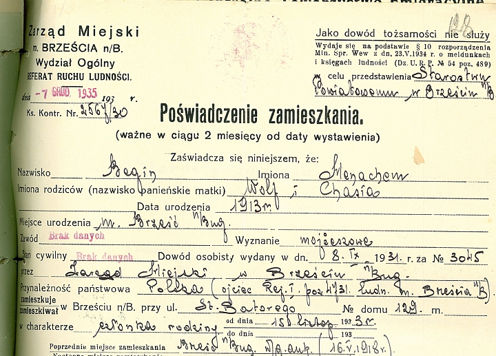 Эти документы, касающиеся брестского периода жизни Менахема Бегина, мне довелось на днях обнаружить в Государственном архиве Брестской области (ф. 2, о. 2, д. 1239).
