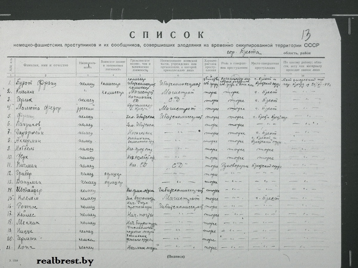 Чрезвычайная государственная комиссия в своем сообщении «О злодеяниях немецко-фашистских захватчиков в городе Бресте» перечислила всех установленных организаторов массовых убийств жителей Бреста.