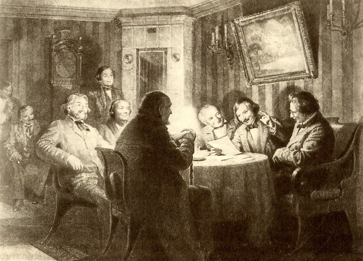 Н.В. Гоголь читает «Ревизора» 5 ноября 1851 на квартире в доме Талызина в Москве на Никитском бульваре (слева направо: Г.П. Данилевский, И.С. Тургенев, С.В. Шумский, П.М. Садовский, М.С. Щепкин, С.Т. Аксаков, И.С. Аксаков). Офорт В. Даниловой и О. Дмитриева, 1951