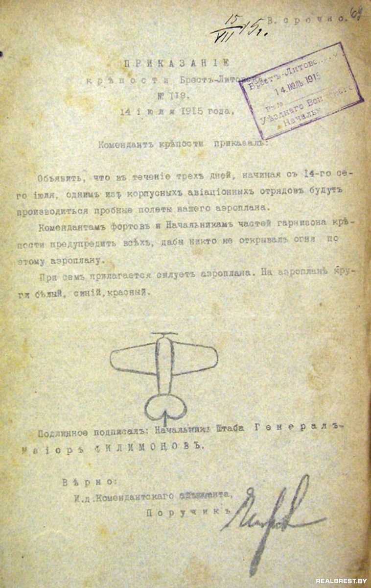 Приказ коменданта крепости Брест-Литовск о пробных полётах аэроплана