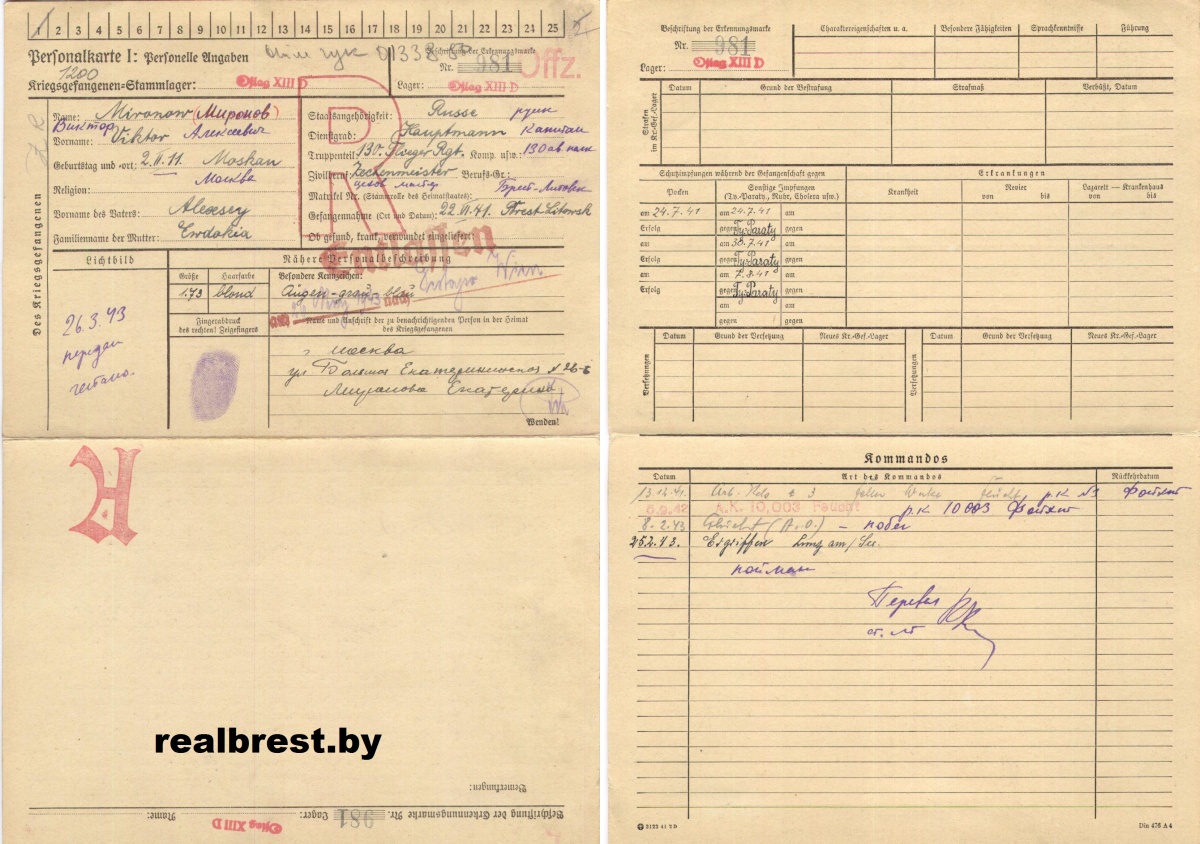 Карточка военнопленного. Миронов Виктор Алексеевич (1911 - ?), в июне 1941 г. – старший политрук, находился в распоряжении командира 130-го СБАП. Пленён в районе г. Брест 22.06.1941 г., вероятно при выполнении боевого задания. Содержался в лагере для военнопленных Oflag XIIID (62), личный номер 981. В плену не выдал своей принадлежности к политсоставу, назвавшись капитаном ВВС КА. Селекции евреев, политработников и коммунистов в Офлаге XIIID проходили регулярно, поэтому можно с уверенностью утверждать, что этот предусмотрительный шаг спас Миронову жизнь в плену. Привлекался к принудительным работам в составе рабочей команды №10003 Feucht (район города Нюрнберг, земля Бавария, Германия). 8 февраля 1943 г. совершил побег, однако 25 февраля был пойман. 26 марта 1943 г. передан гестапо г. Вена. Данных о дальнейшем пребывании в плену нет. Кажется невероятным, но В. А. Миронов. выжил в плену и возвратился в СССР. После спецпроверки Приказом Смоленского ВО №096 от 23.10.1945 г .уволен в запас с постановкой на учёт в Дзержинский РВК г. Москвы.