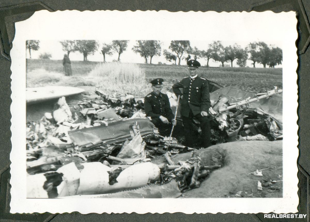 Немецкие железнодорожники на обломках сбитого советского самолёта.