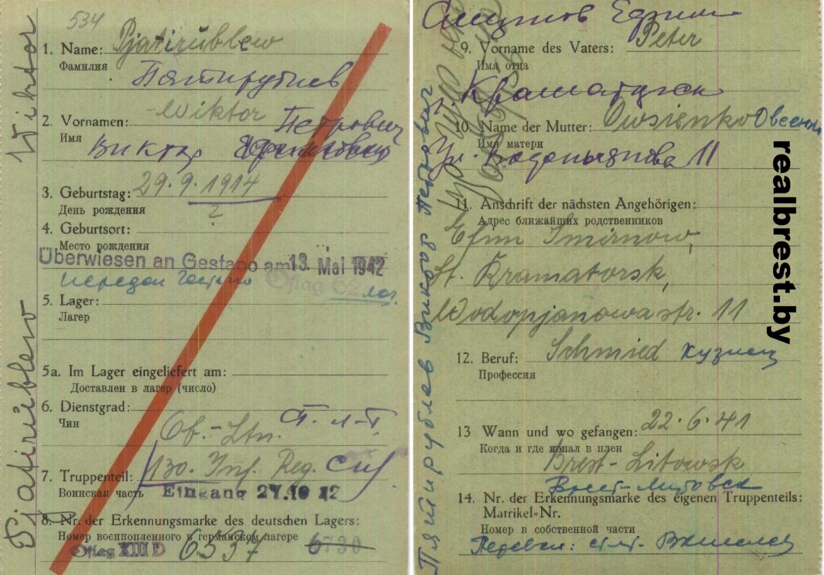 Карточка военнопленного. Пятирублёв Виктор Петрович (1914 - ?), в июне 1941г. – ст. лейтенант, зам. командира авиаэскадрильи 130-го СБАП. По данным ЦАМО РФ пропал без вести 9.07.1941 г. на Западном фронте. Фактически 22.6.1941 г. при выполнении боевого задания в районе Бреста самолёт Пятирублёва был сбит, лётчик взят в плен. Содержался в лагере для военнопленных Oflag XIIID (62), личный номер 6537. 13 мая 1942 г. передан гестапо. Дальнейшая судьба неизвестна.