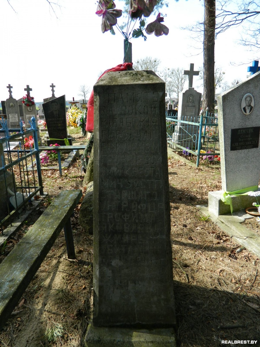 «ПАМЯТЬ ЗА УПОКОЙ РАБА БОЖIЯ ГЕРОЯ НАГРАЖДЕНЫМ ГЕОРГIЕВСКИМИ КРЕСТАМИ 4 3 2 СТП СТАРШАГО УНТР. ОФЦР.ТРОФИМА ЯКОВЛЕВА ЖМИНЬКО УБИТАГО НА ПОЛЕ БРАНИ ЗА ЦАРЯ ВЕРУ ОТЕЧЕСТВЪ 1914 г 31 НЯБ. НА 27 г ЖИЗНИ»