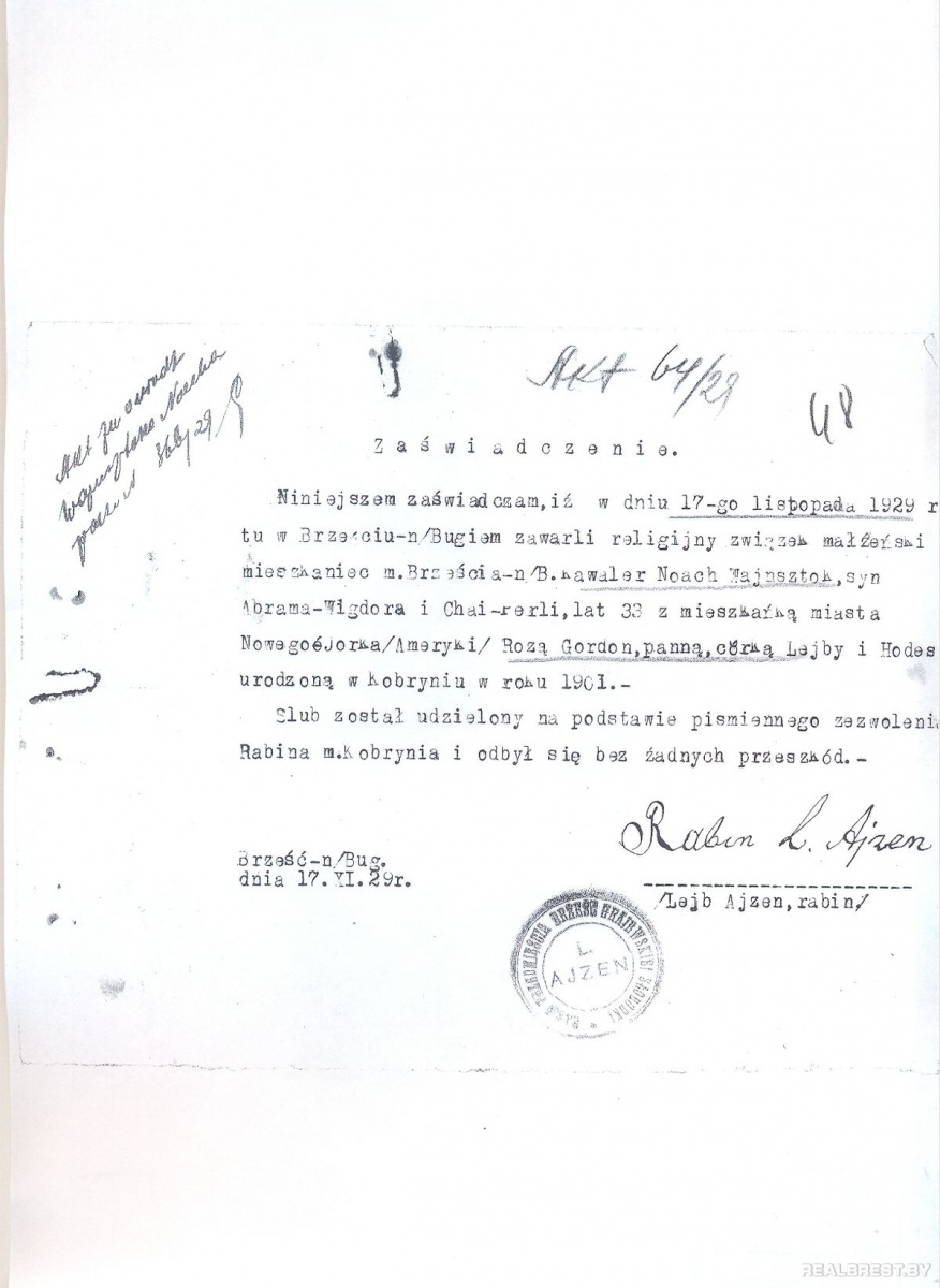 Свидетельство о браке подписанное раввином Лейбом Айзеном. 1929 год Брест-над-Бугом