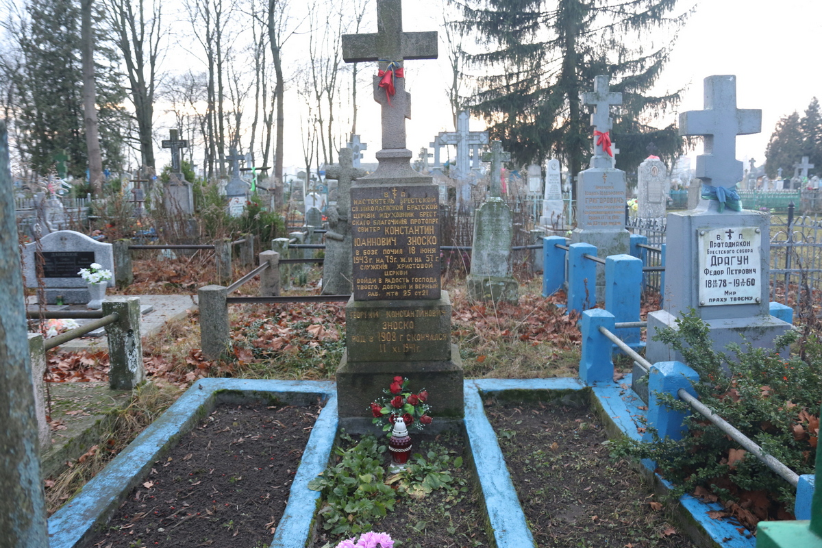 ЗНОСКО Константин Иванович (1 апреля 1865 м. Острино Лидского уезда (ныне Щучинского р-на) – 21 июня 1943 Брест-Литовск) – протоиерей и педагог, духовный писатель, гимнограф, автор ряда акафистов и др. литургических сочинений. Сын священника. В 1887 окончил Литовскую духовную семинарию в Вильно. Рукоположен в сан священника 23.04.1888. До 1901 служил в м. Гудок Виленской губ. С 17.10.1901 по 31.12.1903 был священником Великоритской церкви, далее по личному прошению назначен бесприходным уездным наблюдателем церковных школ Кобринского уезда. С 16.03.1907 до 18.07.1915 священник Свято-Николаевской церкви в Брест-Литовске. Выехал с семьею в эвакуацию в Россию. С 1916 служил полковым священником в 8-м Финляндском стрелковом полку и за доблесть был награжден рядом орденов, а также золотым наперсным крестом на Георгиевской ленте. К Пасхе 1922 вернулся в Брест и стал настоятелем Братской Свято-Николаевской, сменив протоиерея Леонида Романского. Один из организаторов «Русского дома», русской школы и гимназии в Бресте. С 23.06.1937 на пенсии.