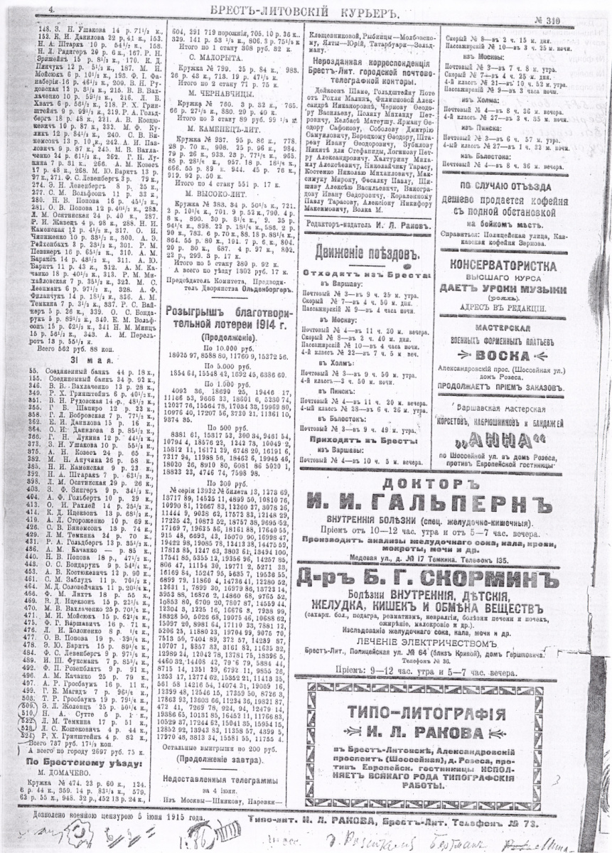А начнем с первенца местной прессы — газеты «Брест-Литовский курьер», дебютировавшей в 1906 году, как сообщил Х.Зоненберг в своей книге История города Бреста-Литовска, 1016 — 1907: По достоверным источникам и правдоподобным умозаключениям. Варшава, 1908. Тот начальный этап был кратким — в год выхода газета вскоре и угасла, чтобы возродиться под тем же названием в 1913 году и просуществовать до жаркого лета 1915-го, до оккупации Бреста австро-германскими войсками. Ее редактором-издателем был Ицко-Зельман Лейбович Раков – владелец типографии в Брест-Литовске с 1902 на ул. Шоссейной (ныне Машерова). Редкий случай, когда типограф и редактор — одно лицо. Обратите внимание, что в 1915 г. газета выходила два раза в день! Ну а мы в 1990 году перекинули мостик через десятилетия и вернули городу это издание под названием «Брестский курьер». Правда, и мы в силу разного рода обстоятельств прервали свои печатные выпуски в конце 2017 года…