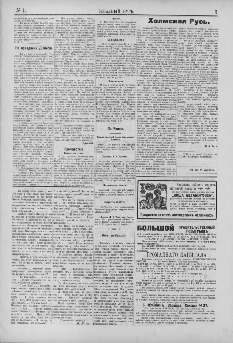 Газета «Западный Буг», редактором-издателем которой была отважная дама О.Н.Кундич, выходила в Брест-Литовске в 1909 году с 1 января по 19 апреля ст. ст. с периодичностью два раза в неделю. Печаталась в типографии И.Ракова. Вышло всего лишь 30 номеров. В газете публиковались материалы по истории, экономической, общественной и культурной жизни города и Гродненской губернии; о тяжелом положении батраков (5.4.1909), эмиграции крестьян Гродненской губернии в Америку, их безрадостной жизни на чужбине (1.2.1909), о судебном процессе по делу руководителя Брестской организации РСДРП Г.А.Клевера (11.2.1909), о народных библиотеках Гродненской губернии. Много места отводилось местной информации. Публиковались и литературные произведения. – Источник: Энциклопедический справочник «Брест», 1987.