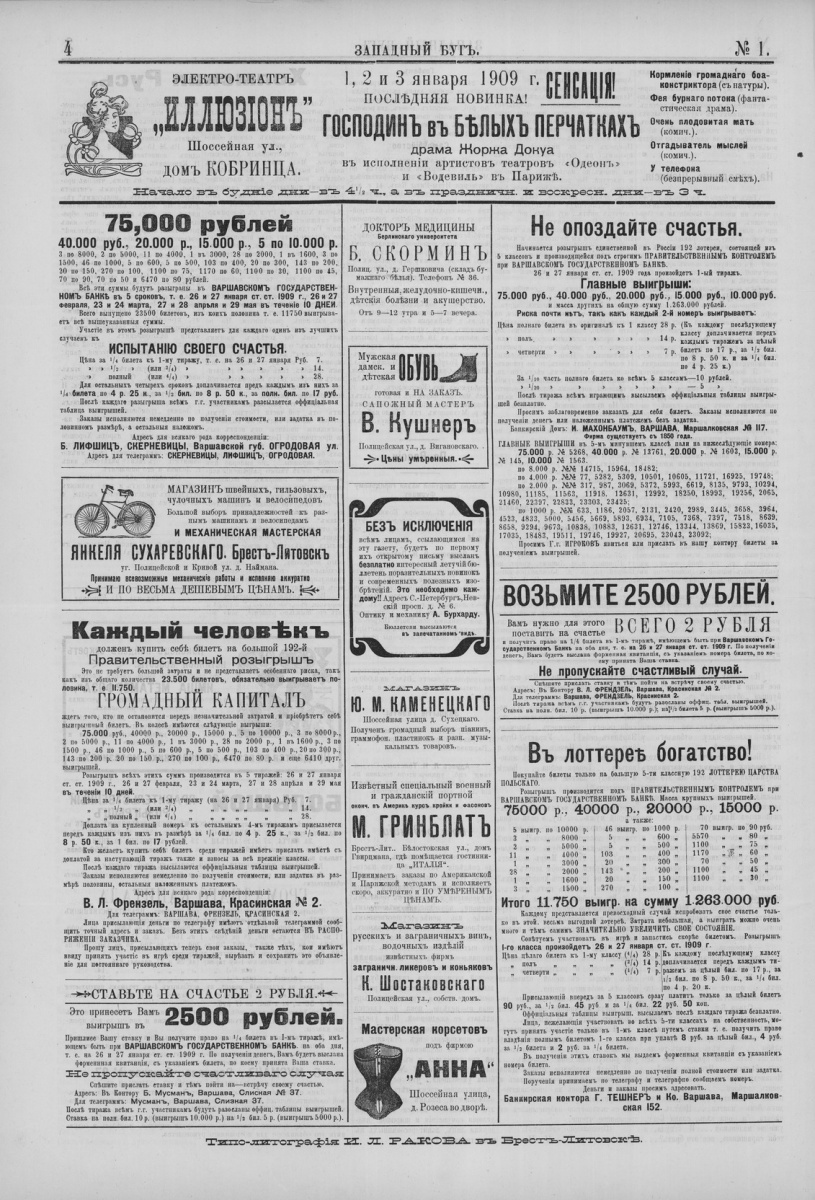 Имею честь довести до сведения Брестской почтеннейшей публики, что мною выписан из Варшавы новый состав оркестра, который играет от 1 до 3 часов дня и от 9 до 2 часов ночи. Льщу себя надеждой, что почтеннейшая публика удостоит меня своим любезным посещением.
