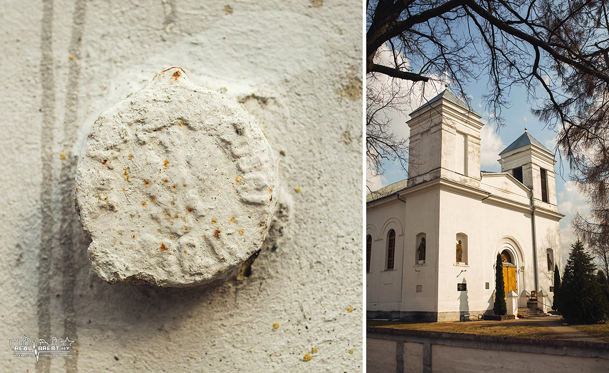 Болтовой репер на фасадной стене католического костёла в Кобрине
