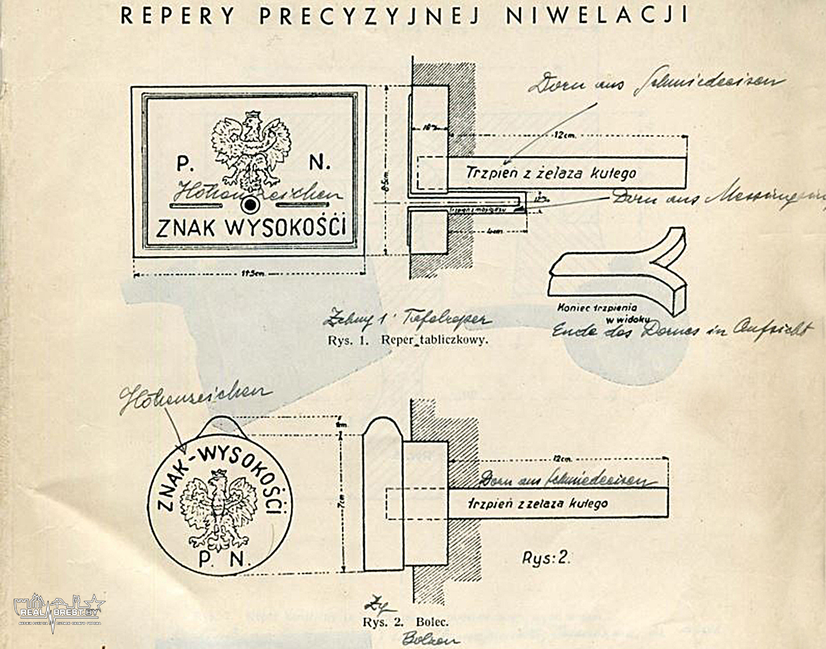 Геодезические реперы подразделялись на табличные, болтовые и каменные с заклепками. Табличные и болтовые устанавливались на стенах капитальных зданий и костелах, а так же мостовых опорах с пометками P.N. (Precyzyjna Niwelacja) – точное нивелирование. Или с пометкой M.R.P. (Ministerstwo Robot Publicznych) - Министерство Общественных Работ.