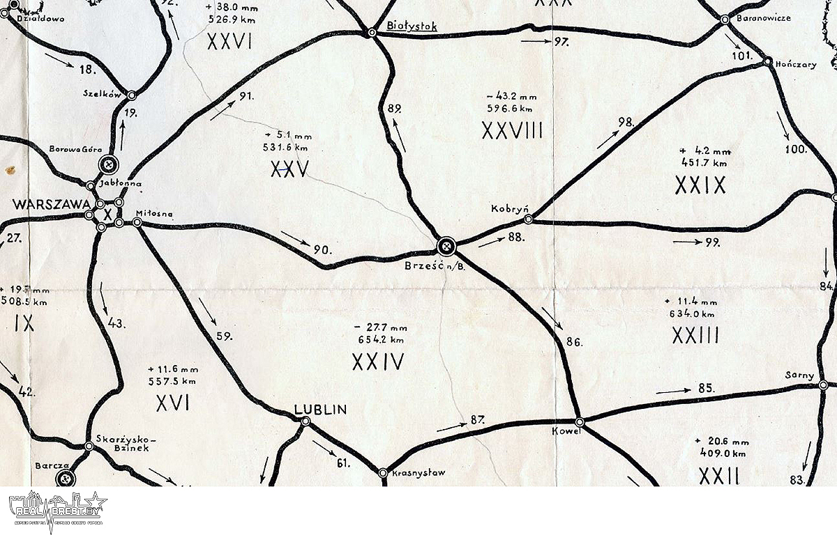 В период межвоенной Польши через наш город проходили 4 линии нивелирования высот: Брест-Ковель, Брест-Милосна, Брест-Белосток и Брест-Кобрин. По этим линиям устанавливались табличные и болтовые реперы в капитальных зданиях, мостовых опорах, а также в виде металлических столбов вдоль дорог с промежутком 8-10 км между ними.