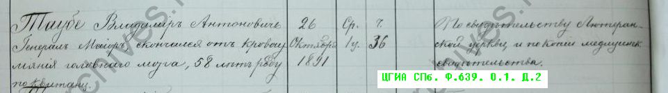 У барона Антона Максимовича Таубе в последующем было четыре сына. Старший – Александр (Александр Фридрих) Антонович Таубе (1825-1875) дослужился до генерал-майора, умер от тифа, будучи Витебским губернским воинским начальником (он был отцом уже упомянутого мною ранее А.А.Таубе и дедом Ирины). Еще один сын Роберт Антонович прожил немногим более двадцати лет, более ничего о нем не известно. Следующий – Максим (Магнус Карл) Антонович Таубе (1826-1910) стал крупным военным и государственным деятелем, генерал-лейтенантом, членом Государственного совета с великим множеством наград – он прожил дольше всех других братьев, включая и младшего Владимира Антоновича Таубе, нашего брестского барона.
