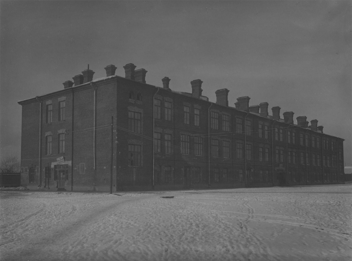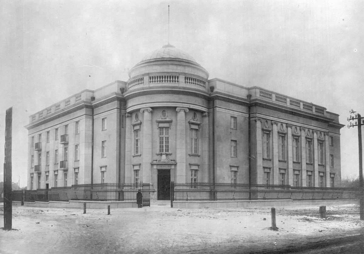 Оно же с другого ракурса. Слева от него на зелёном пустыре 12 октября 1930 года была антигерманская демонстрация, которую мы уже видели в первой части. На заднем плане идёт ремонт здания, улица вымощена брусчаткой, а на тротуаре положили широкую плитку. Покосившиеся деревянные столбы и пустыри за забором придают колорита!
