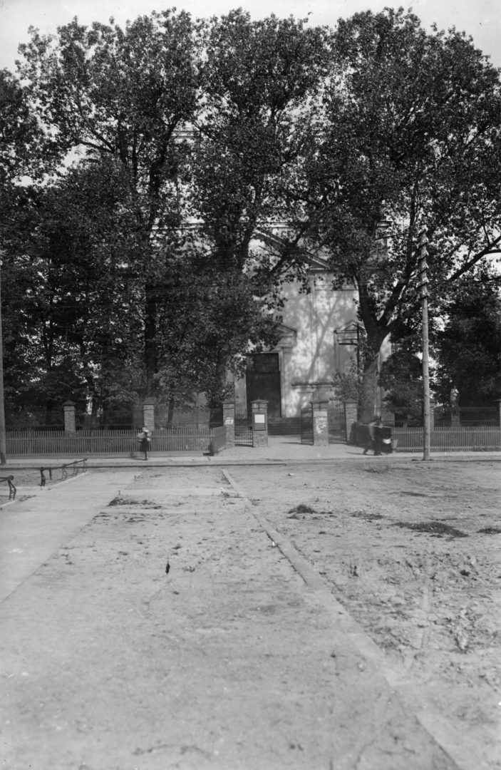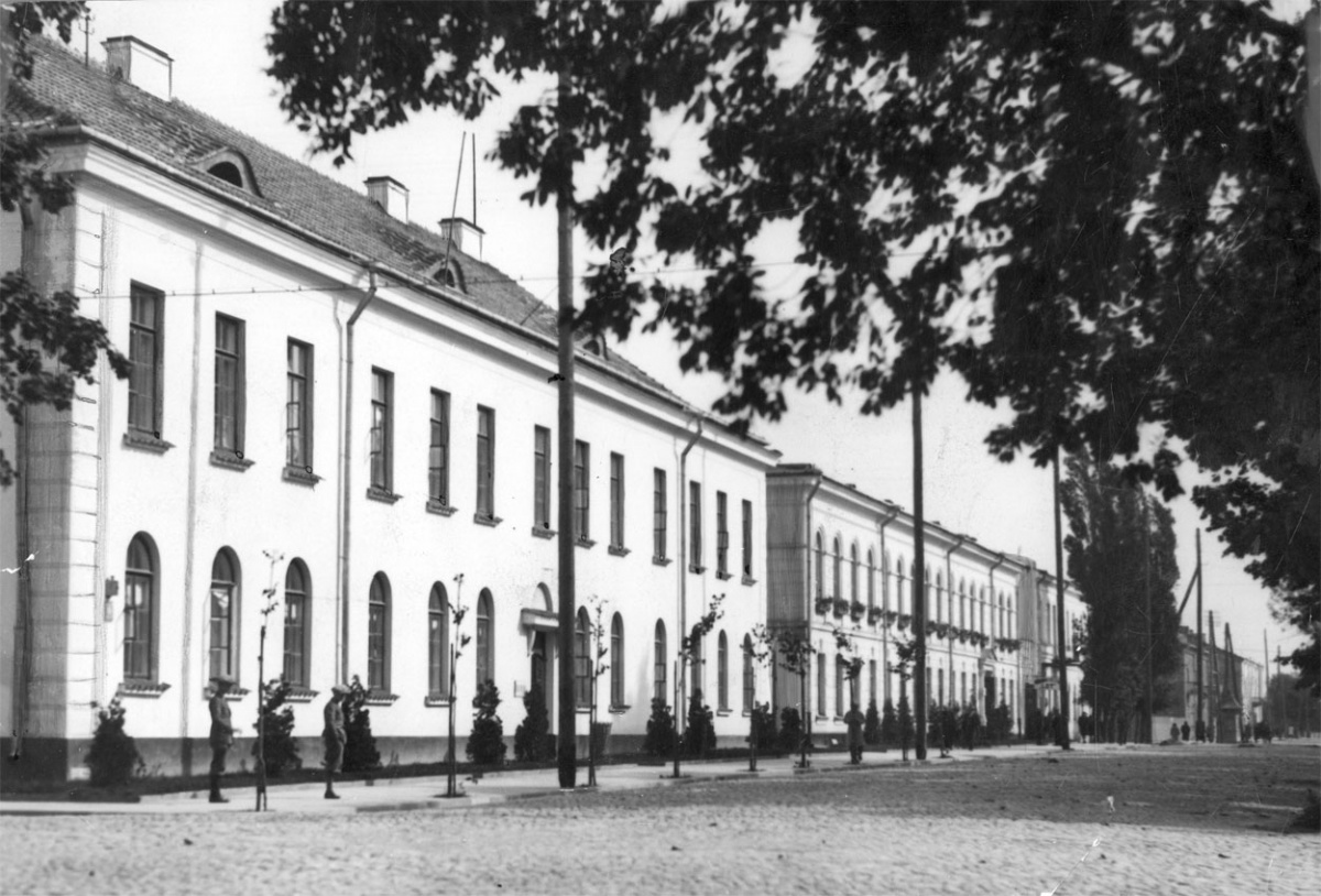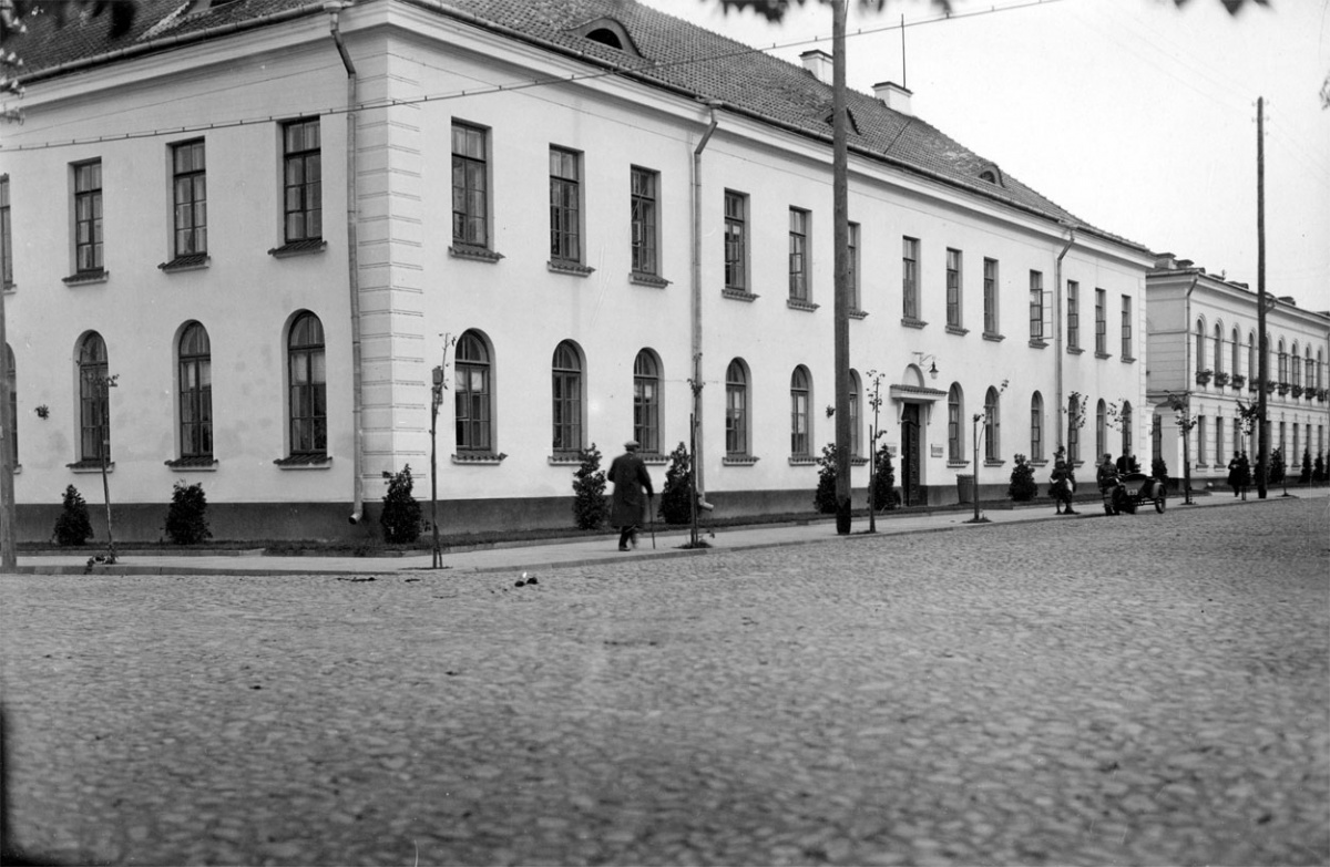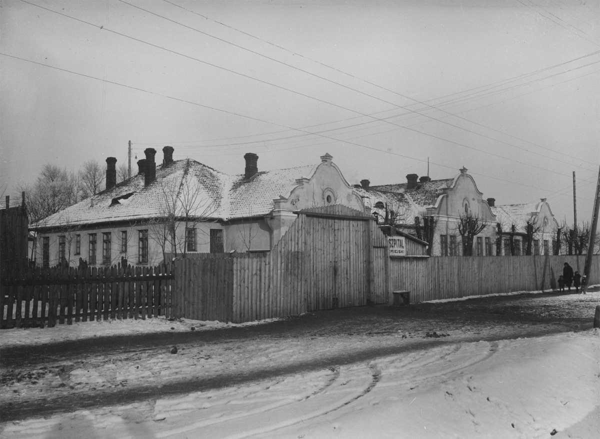 Больница в Бресте где-то в 1920–1939 годах. Примечательны несколько деталей. Конечно, это — заборы, особенно огромный сплошной больничный забор, который выше женщины с детьми. Максимально обрезанные деревья тоже на себя обращают внимание. Последняя деталь — водосточная труба. Обратите внимание, какие у них элегантные элементы у крыши.
