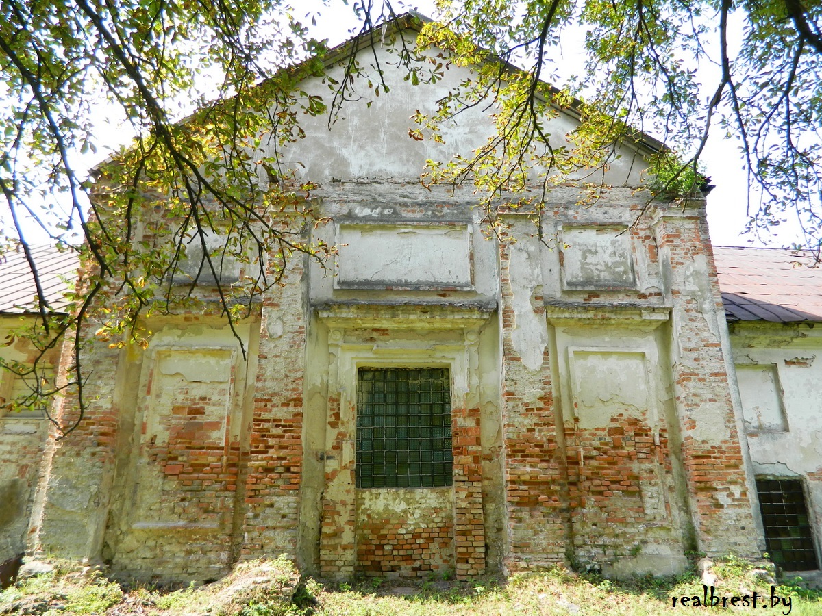 Двери входные большие двойные с теса соснового на завесах и крюках железных с замком внутренним болтом и засовом. Над этими же дверями доска большая дубовая черная с надписями золотыми буквами «Ко спасению ближних». А также с выражением года, в котором этот костел был сфинансирован. По левой стороне за входными дверями в костеле деревянные лестница со стенкой на хор который опирается на 2 деревянных столбах плотницкой работы. Просторность этого костела есть такова: длина аршинов 15, ширина аршинов 11. Окон всех 4 .... стекла, обрамленные деревом, пол кирпичный. Потолок из теса соснового положен и подштукатурен. По правой стороне большого алтаря двойные двери, а по левой одинарные сосновые хорошо окованные железом. Выход теми же дверями в сакристию через коридор который имеет ширину в 2 аршина и длину в 14. Пол кирпичный. Потолок из теса уложенный, окон 2 клетками железными с запорами деревянными, входя в сакристию через двойные двери сосновые на крюках и завесах железных с внутренним замком в (…), окно клеткой железной деревом обрамлено, пол кирпичный. Потолок с теса уложен. Черепицей покрыт. Весь костел, стены потолок карнизы и покрытье черепицей в хорошем состоянии.