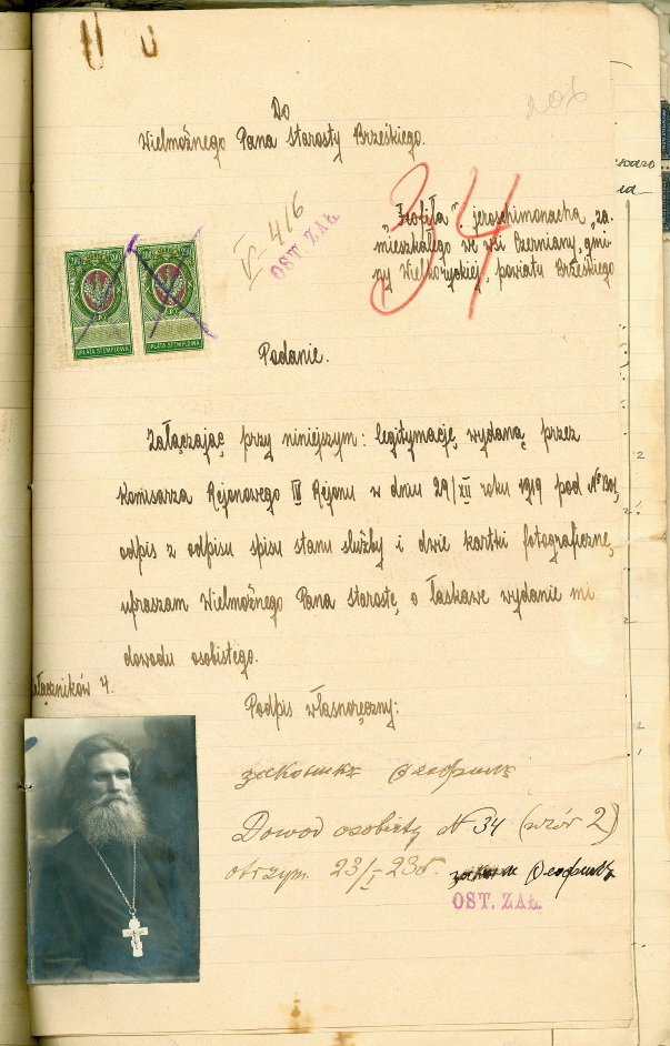 Рассказать об этом подвижнике православия побудили меня обнаруженные в Госархиве Брестской области документы – датированное 1923 годом прошение в Брестское староство иеромонаха Феофила (Нестерука) на выдачу ему удостоверения личности (dowodu osobistego), а также приложенный к сему Послужной список просителя (ф. 2, о. 1, д. 539).