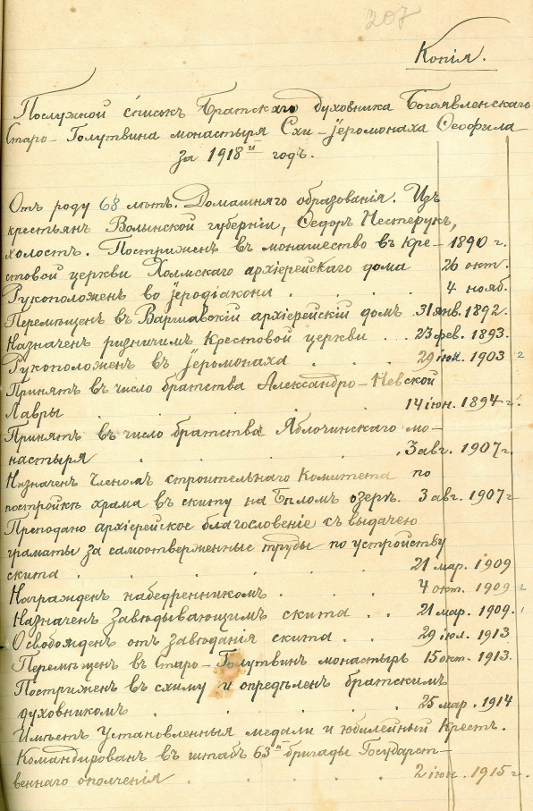А теперь хотя бы пунктирно обрисуем предшествующую этому линию его судьбы, основываясь на найденном нами послужном списке, датированном 1918 годом. В том году схимнику Феофилу – в прежней жизни Федору Нестеруку, уроженцу Волынской губернии, из крестьян – было 68 лет. При подсчете можно сделать вывод, что год его рождения – 1850-й. Пострижен в монашество он был в Крестовой (домовой) церкви Холмского архиерейского дома 26 октября 1890, рукоположен в иеродиакона 4 ноября.