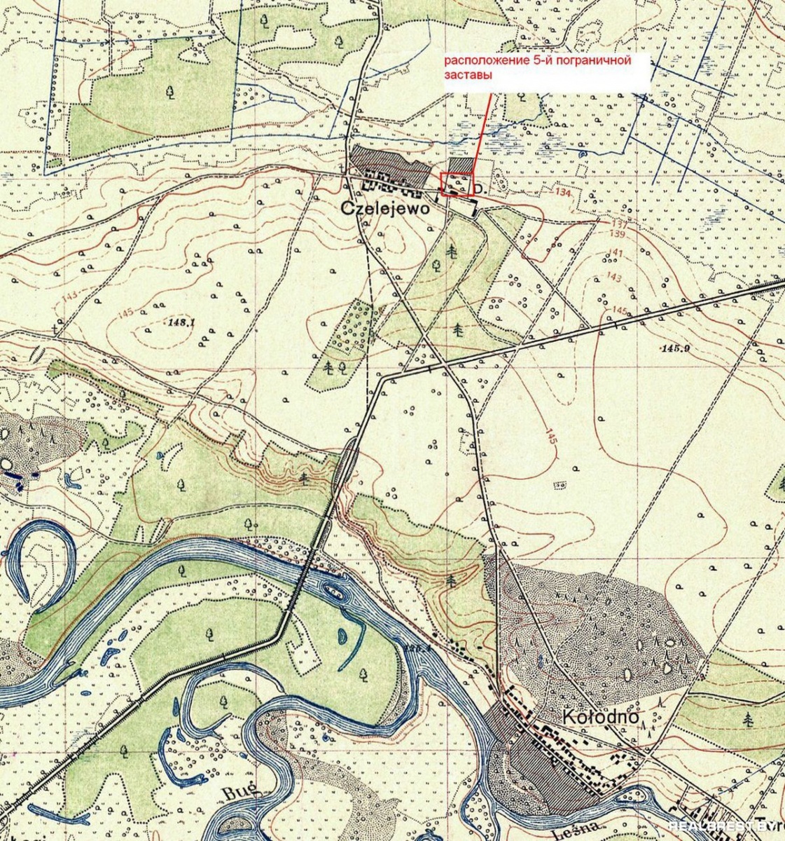 Топографическая карта с обозначением расположения 5 пограничной заставы на местности.