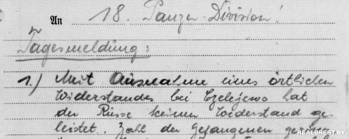 Фрагмент дневного донесения штаба 18-й мотопехотной бригады в штаб 18-й танковой дивизии с упоминанием боя у Чилеево. 22 июня 1941 г.