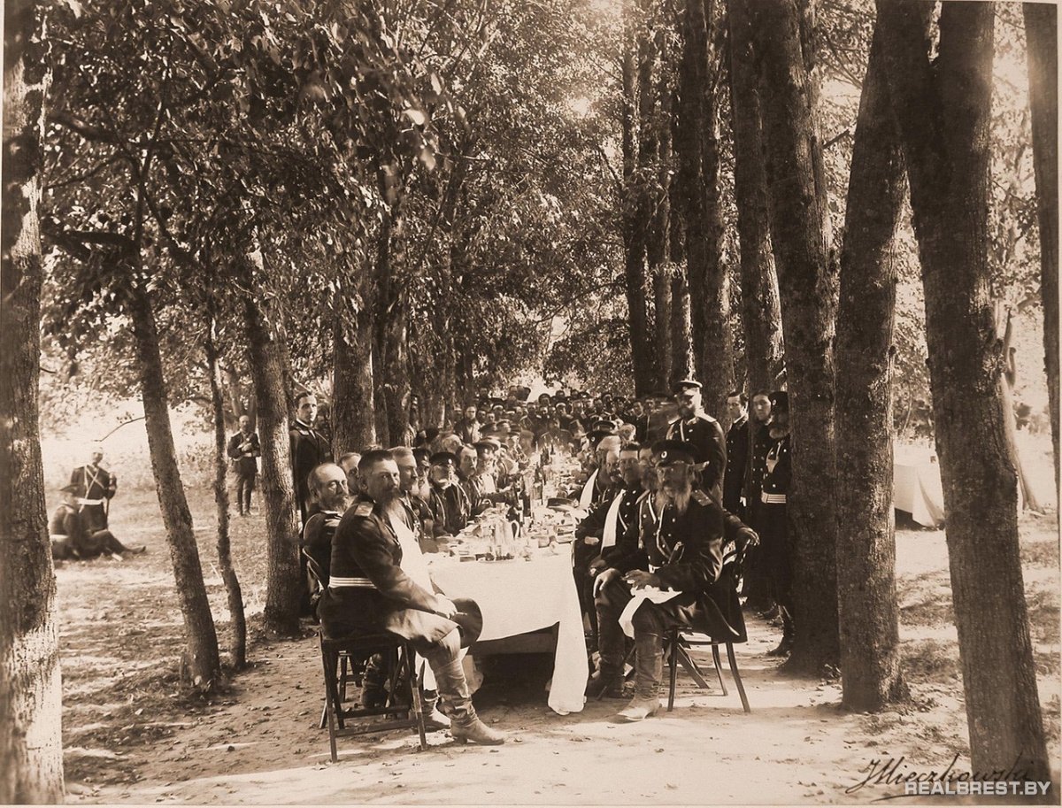 Александр III (во главе стола), императрица Мария Федоровна (рядом с ним) в группе военных чинов во время обеда в саду имения Шестаково.