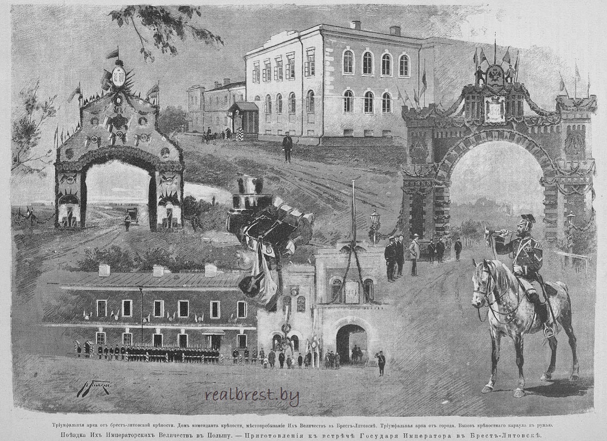 На пути следования в крепость были воздвигнуты две большие триумфальные арки: первая – от города, вторая – от крепости; крепостная арка была украшена различными военными доспехами. Близ городских триумфальных ворот стояли ученики брестской прогимназии, за ними находились ученицы четырехклассного женского пансиона с начальницею, госпожой Грасман; далее - ученики и ученицы местных приходских школ; мальчики были одеты в красные рубашки. Ученики и ученицы усыпали путь императорского кортежа цветами. При громе орудий император прибыл в крепость. Прежде всего, Александр III посетил крепостной собор, где был встречен местным духовенством. В крепости, возле собора, находились ученицы и ученики крепостного приходского училища. Из собора он проследовал в комендантский дом, у которого был выставлен почётный караул от лейб-бородинского пехотного полка, в полном составе роты со знаменем и музыкой. Александр III, приняв рапорт, поздоровался с караулом, прошёл по его фронту и пропустил роту церемониальным маршем по отделениям. Затем в комендантском доме, в три часа дня, состоялся завтрак, после которого император с лицами свиты посетили брест-литовский военный госпиталь, где сперва посетили церковь; местный священник встретил августейших особ с крестом и святою водою. Александр III обошёл все палаты и поговорил с больными, всех больных в этот день было 158 человек. Из госпиталя все отправились на военную племенную голубиную станцию, где разводились почтовые голуби для военных целей. Станция находилась под управлением подполковника Якова Ивановича Петерсона, во время посещения станции количество голубей достигало 351. В присутствии Александр III было выпущено с этой станции на другую 43 голубя. После этого император с лицами свиты проехали и осмотрели военную брест-литовскую паровую пекарню; а отсюда направились в экипажах на форт и присутствовали при вооружении его крепостною артиллериею. Вооружение форта происходило быстро, и очень скоро последовали выстрелы из орудий.