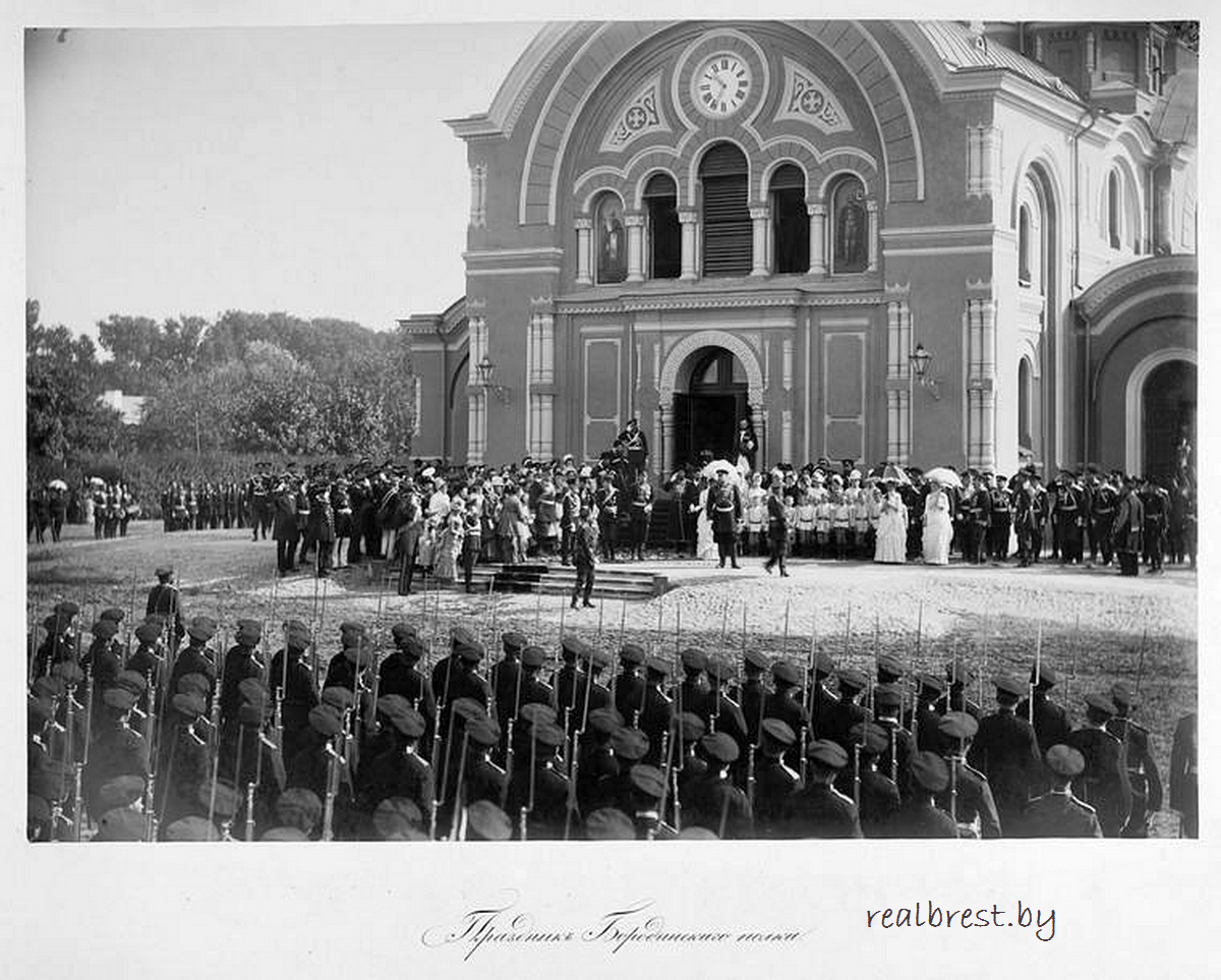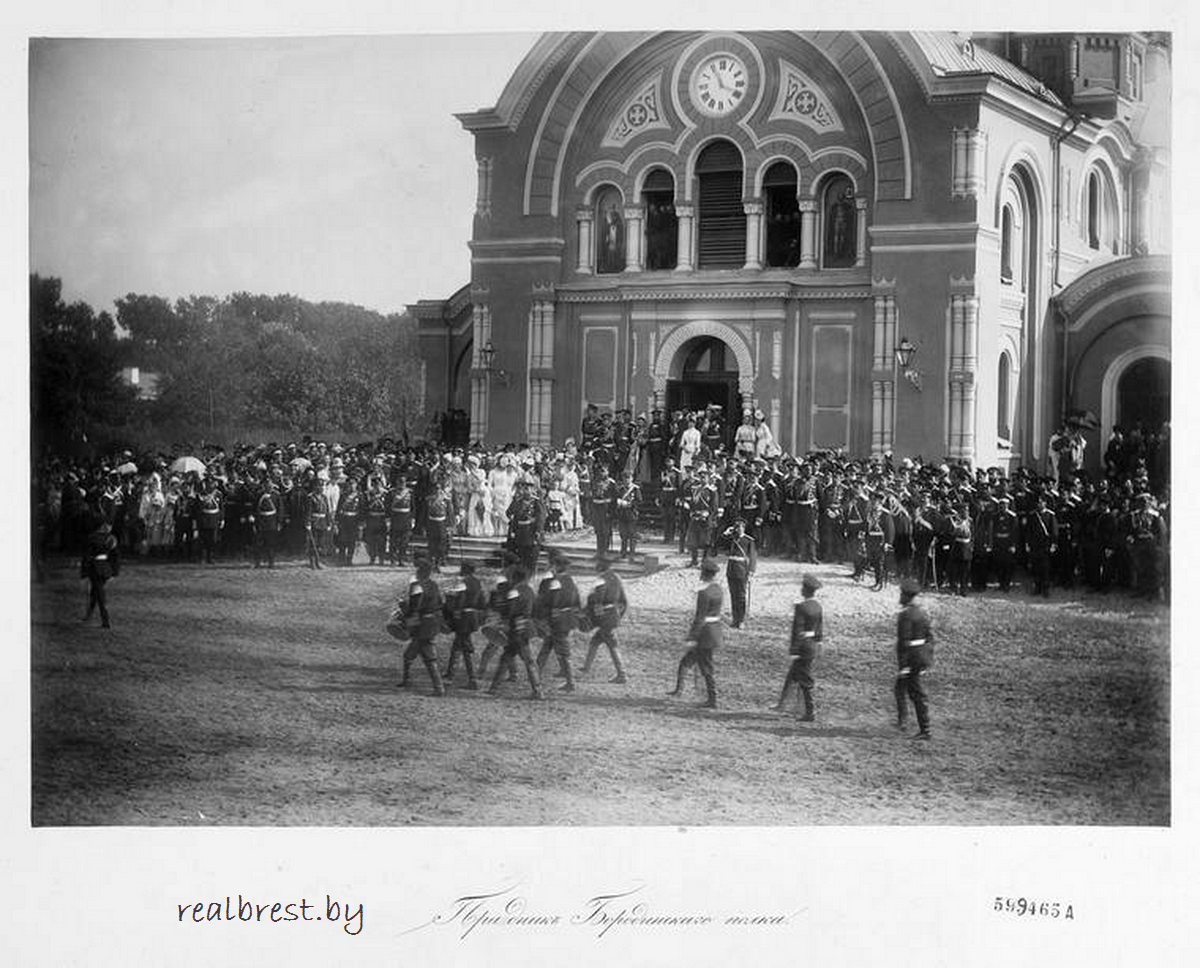 По окончании литургии, все вышли из собора к войскам, которые перестроившись по - полуротно, прошли один раз церемониальным маршем. По окончании парада Александру III представлялись ординарцы и полковые адъютанты от шефских частей. В час дня, в здании зимнего помещения офицерского собрания был сервирован завтрак на 215 приборов, к которому были приглашены кроме лиц свиты, все офицеры частей войск, участвовавших в церковном параде. Колонны зала, где был подан завтрак, были изящно увиты зеленью. Высочайший стол находился в ротонде, украшенной портретом императора и убранной гирляндами из живой зелени. Во время завтрака играли два хора музыки – лейб-бородинского пехотного полка и местной резервной бригады. За завтраком Александр III провозгласил тост за здоровье лейб-бородинского полка и батальонов, причем музыка исполнила марш этих частей. По окончании завтрака император спустился в нижний этаж, где беседовал с офицерами, а затем простившись, отбыл в комендантский дом. В этот же день посетил лагерь крепостной артиллерии. На пути следования в артиллерийский лагерь, императорский кортеж восторженно приветствовали рабочие, занятые работами на брестских крепостных фортах.