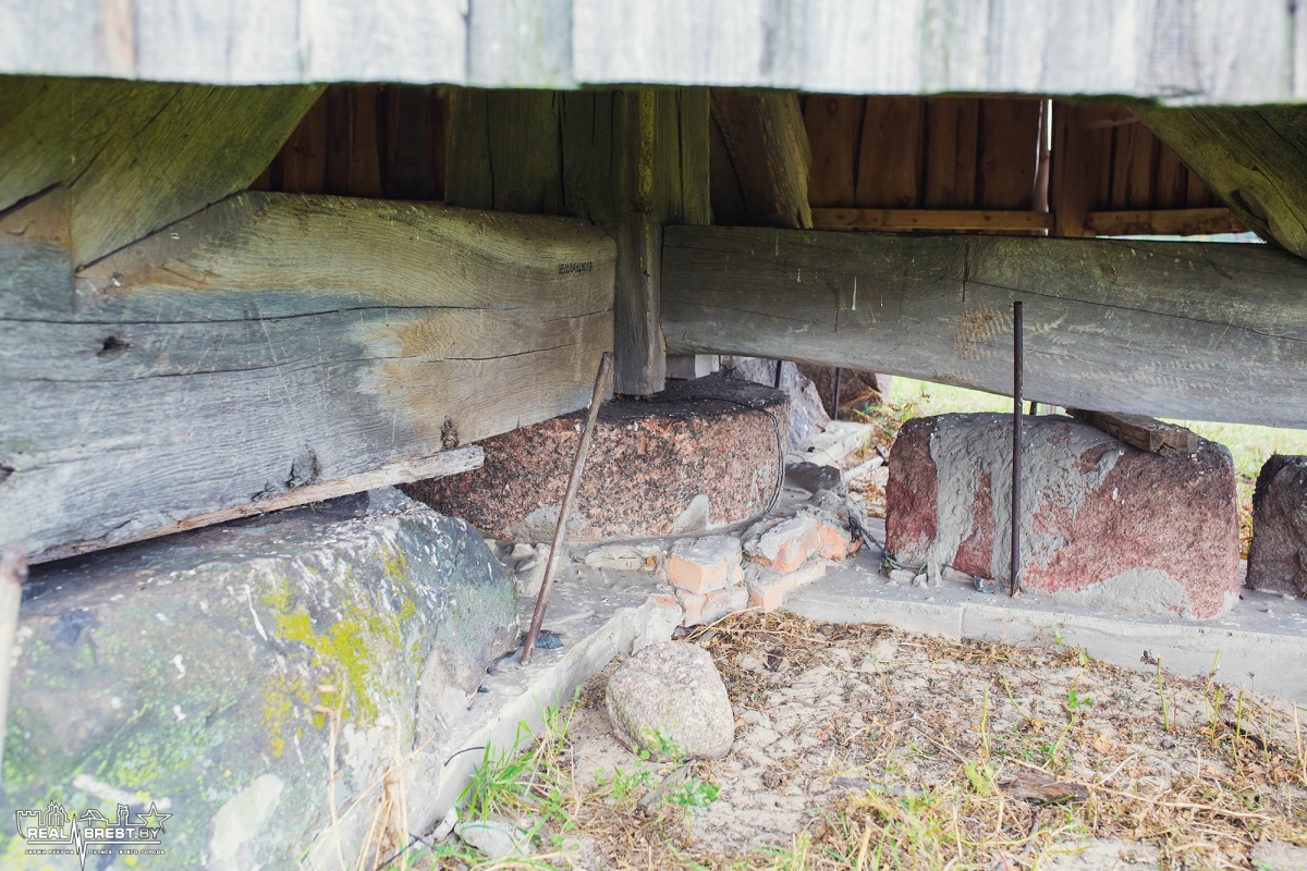 Высокий обшитый досками почти квадратный в плане каркас с 2-скатной крышей поворачивался вокруг центрального столба, укрепленного на крестовине из толстых бревен - козлах. Вместе с крыльями поворачивалась к ветру на неподвижном фундаменте вся мельница с находящимся внутри нее механизмом.