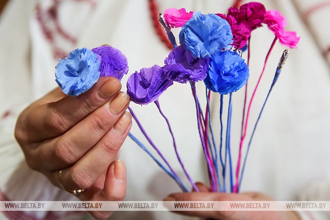 Изготовление венка занимало около месяца, делать его невесте помогали подруги. В качестве материалов использовались белая и цветная бумага, цветные ленточки, девушки из зажиточных семей могли позволить себе в украшении бусины. "Пава" состоит из двух частей. Первая - сделанный из проволоки обруч диаметром 6-7 см, обвитый зеленой лентой в знак того, что у девушки начинается новый период жизни. Вторая часть убора - цветы. Крепились они на проволочные стебельки длиной около 20 см. В одном букетике (в венке их должно быть не меньше семи) насчитывается десять цветочков. Чем богаче невеста, тем пышнее была ее "пава", - пояснила Людмила Янущик.