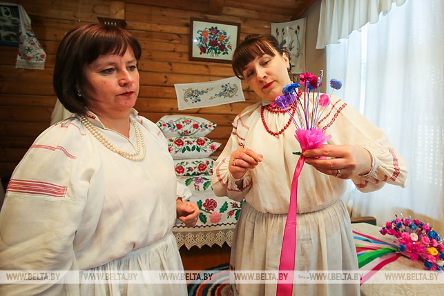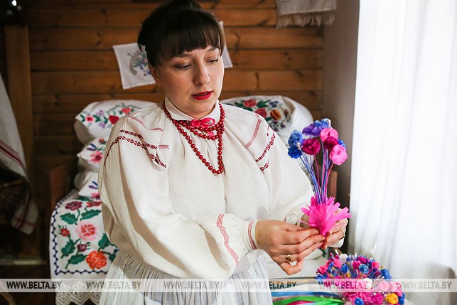 "Такой венок бытовал только в нашей местности в 20-30-х годах ХХ века. Как делать "паву", расспрашивали пожилых женщин, узнавали все по крупицам - теперь решили воссоздать технологию плетения", - вводит в курс дела младший научный сотрудник музея Людмила Янущик.