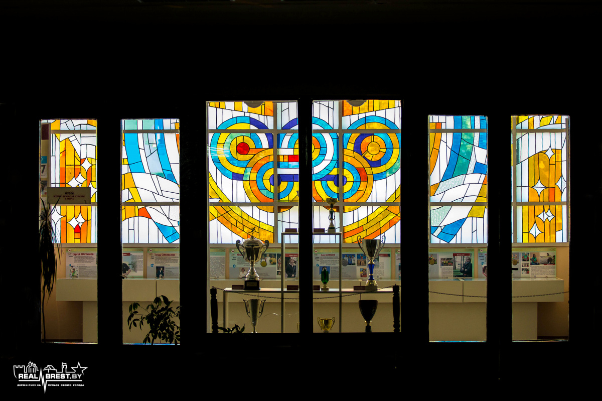 Витражная группа в холле 2-го этажа спортивного комплекса БрГУ. Автор неизвестен.