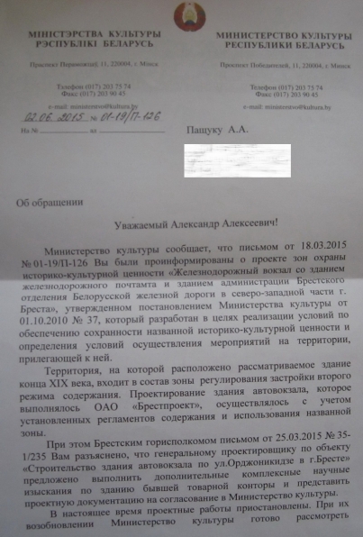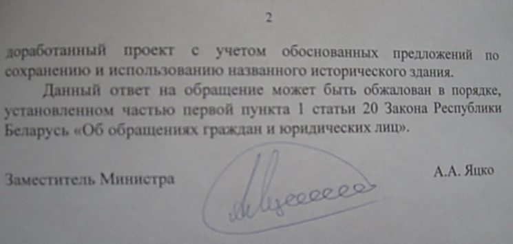 P.S.: Хочу, для читателя, представить ответ, полученный от Министерства Культуры РБ за подписью заместителя Министра Культуры РБ Александра Анатольевича Яцко: