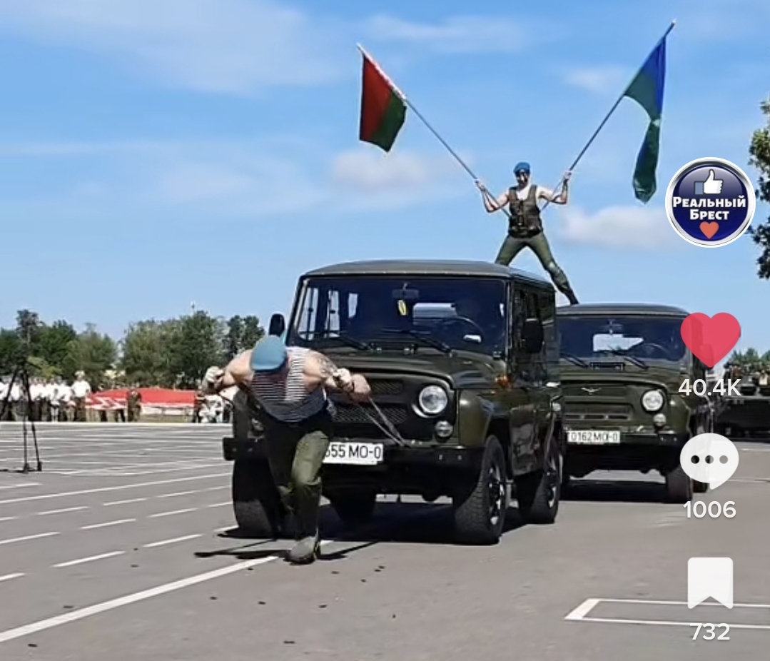 Больше миллиона просмотров набрал ролик, где десантник в Бресте тянет три автомобиля УАЗ с девушкой на крыше