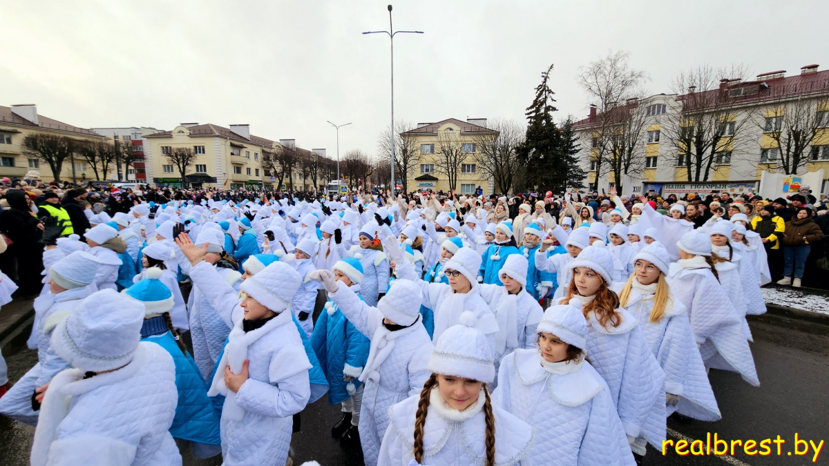 Зрителей поздравили с Новым годом около 200 пар Дедов Морозов и Снегурочек.