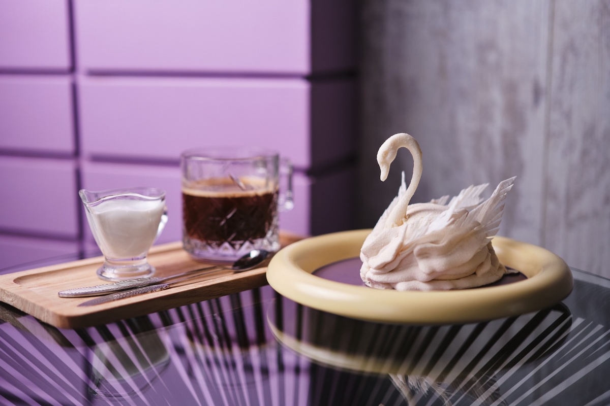 ●Десерт «Лебедь» (основа – ванильный мусс с нотками специй, внутри – ягодный конфитюр и свежая брусника, которые создают баланс сладости и кислинки. Фигурка лебедя выполнена из белого шоколада, а его крылья сочетают две текстуры: хрустящую вафлю и нежный яблочный зефир), 105 г