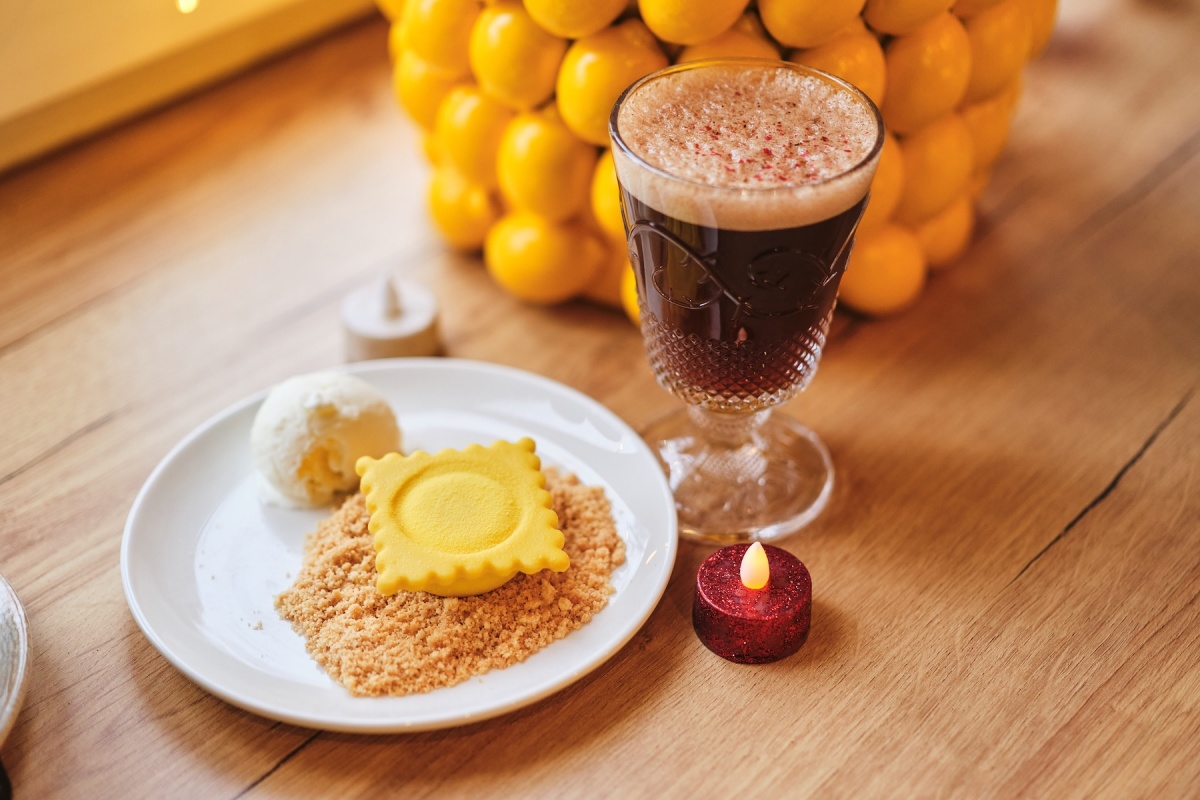 ●Десерт Равиоли (клубничный гель с базиликом и бальзамическим соусом, ганаш с рикоттой и сметаной, песочная печенька и крамбл с добавлением миндальной муки, шарик ванильного мороженого), 90 г