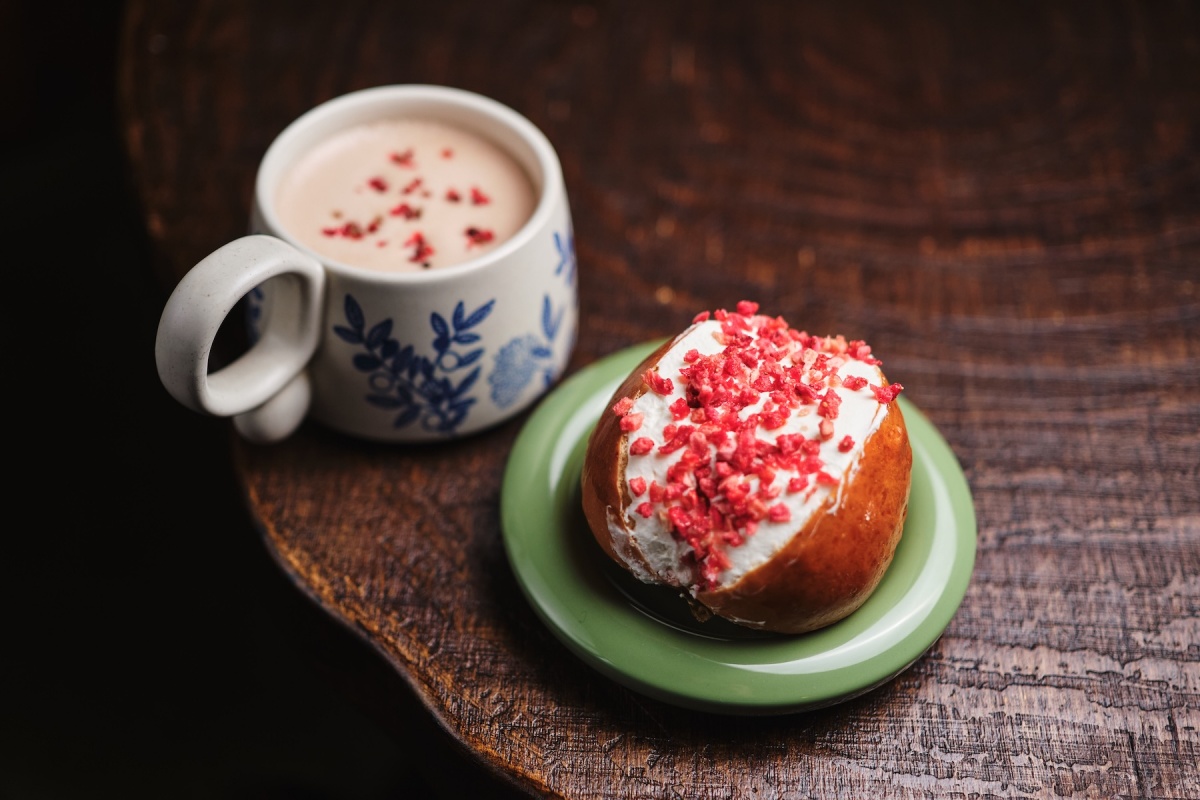 ●Малиновый латте макиато с хрустящей карамельной корочкой и сублимированной малиной, 350 мл