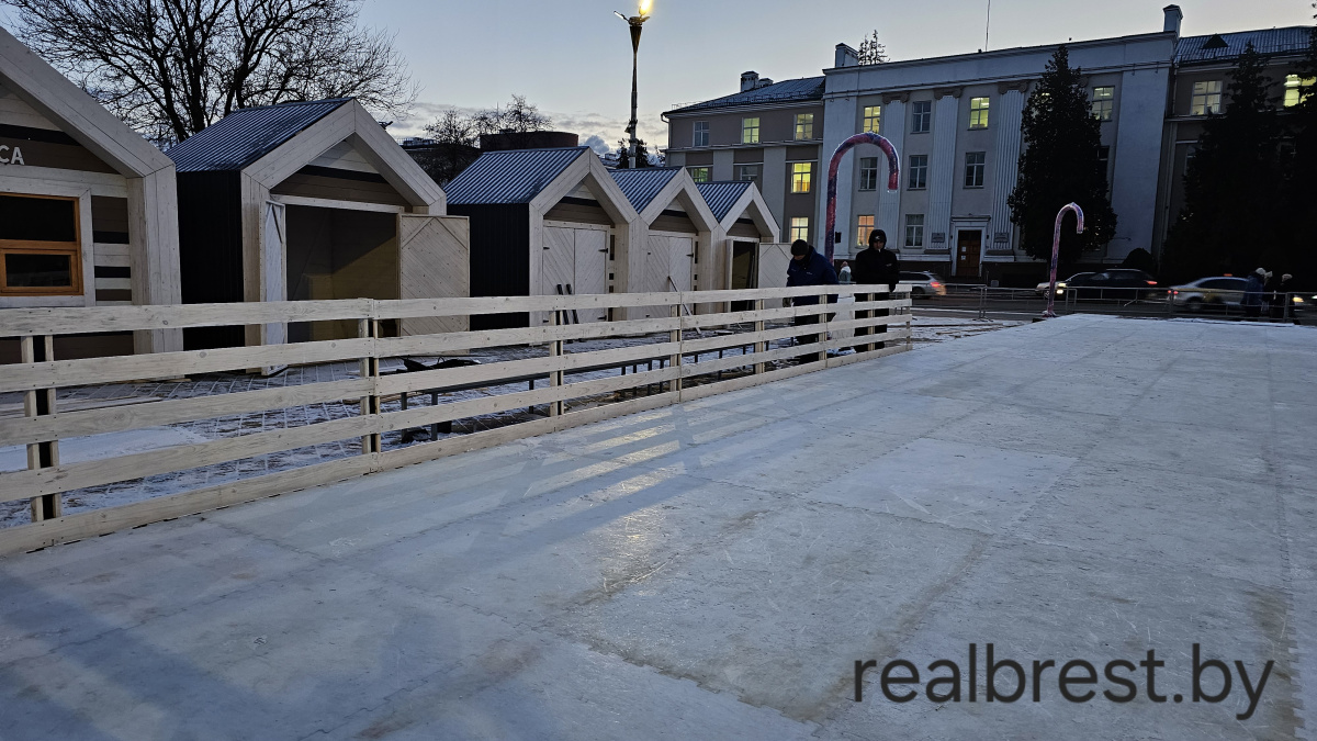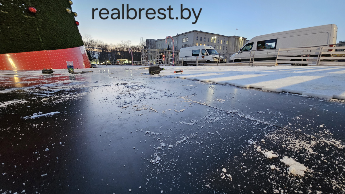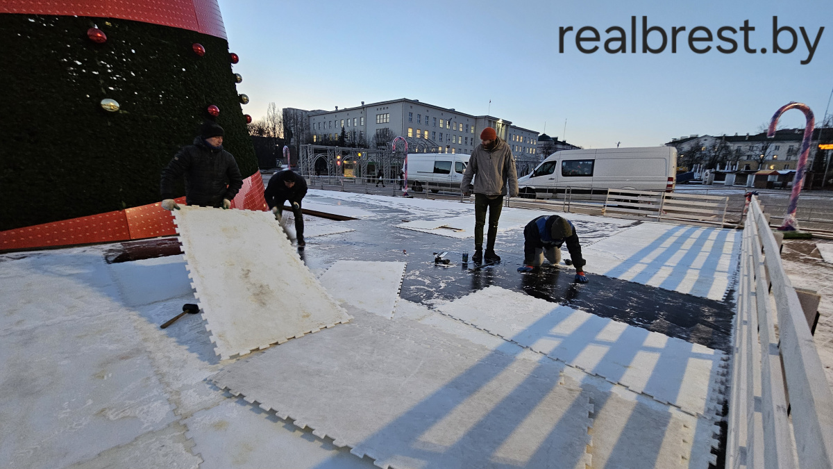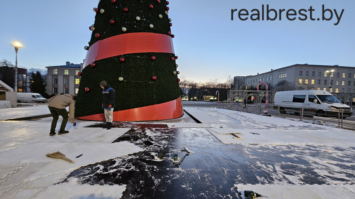 Об этом «Реальному Бресту» сообщили на площади Ленина работники, которые устанавливают синтетическое покрытие искусственного катка вокруг главной новогодней ёлки города.