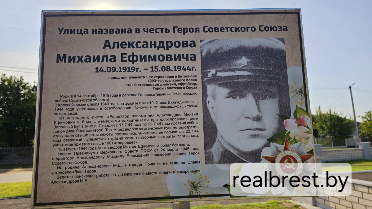 Согласно данным из наградного листа, Михаил Александров был наводчиком пулемета, он один отразил атаку свыше роты пехоты пртивника при форсировании реки Западный Буг в районе деревни Страдечь. Теперь табличка с именем Героя Советского Союза будет установлена на одноименной улице населенного пункта.