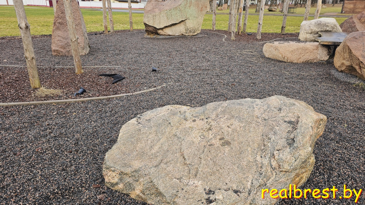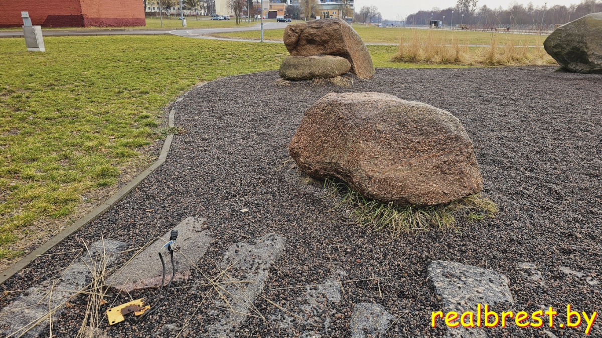 Саженец сосны когда-нибудь на конец-то, согласно концепции «Парка валунов», приживётся, а провода замотаны изолентой.
