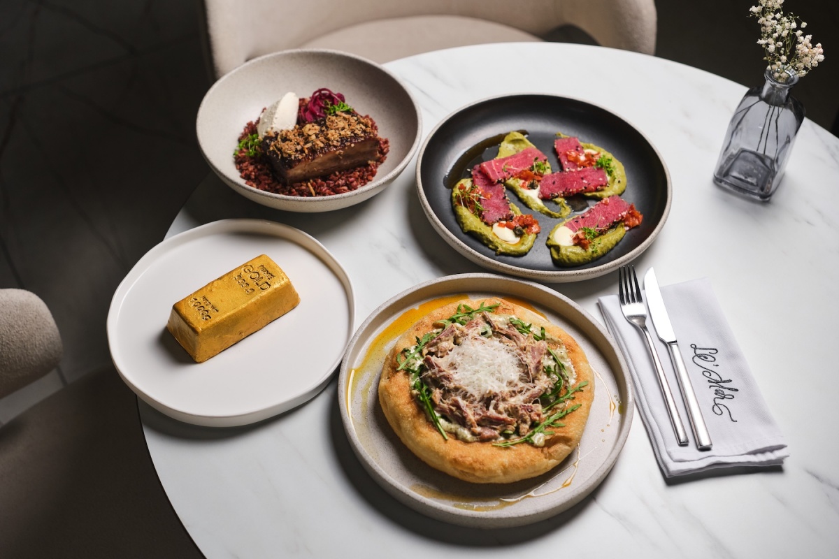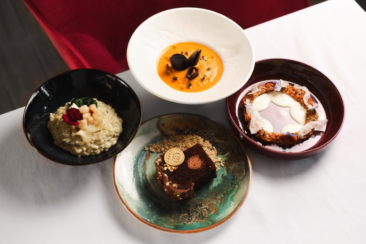 ●Закуска "Антипасти Портороссо" (сливочный мусс из рикотты, дополненный ярким ассорти из маринованного личи и чили, а также кислинкой томатного рыбного соуса. Подается с ягодным луком и домашней фокаччей)