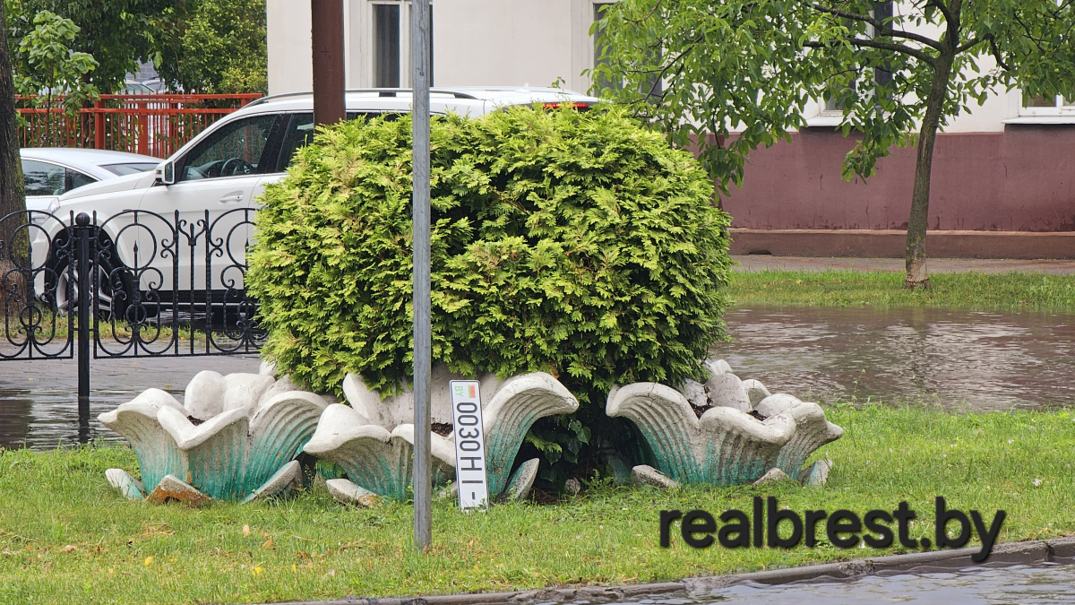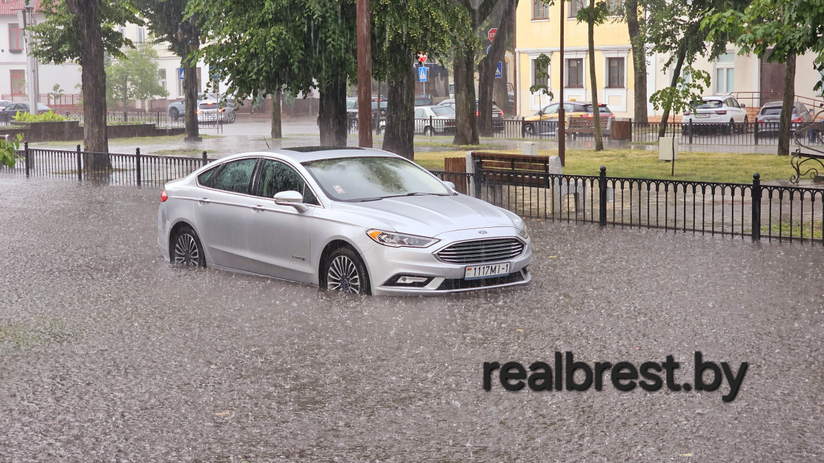 Традиционно сильные дожди затрудняют движение автотранспорта в центре города Бреста.