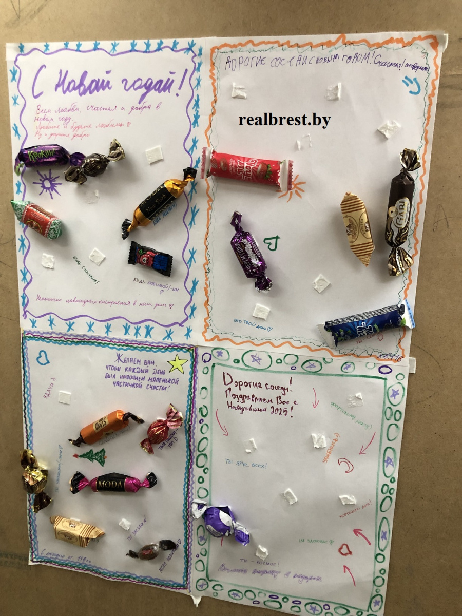 Необычным способом решили друг друга поздравить с Новым годом и поднять настроение соседи одного из подъездов дома, расположив стенд с пожеланиями и конфетами в лифте, по улице Бориса Маслова в Бресте: